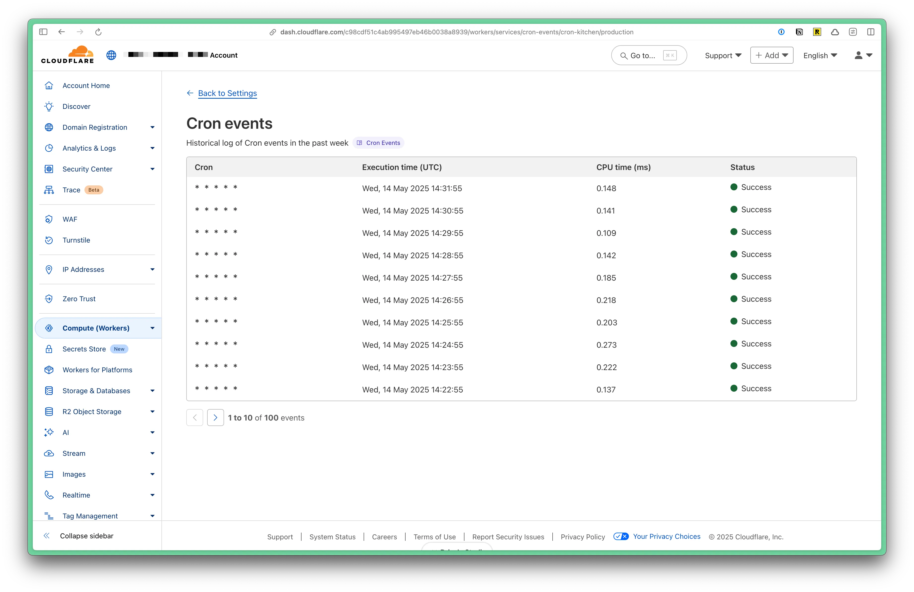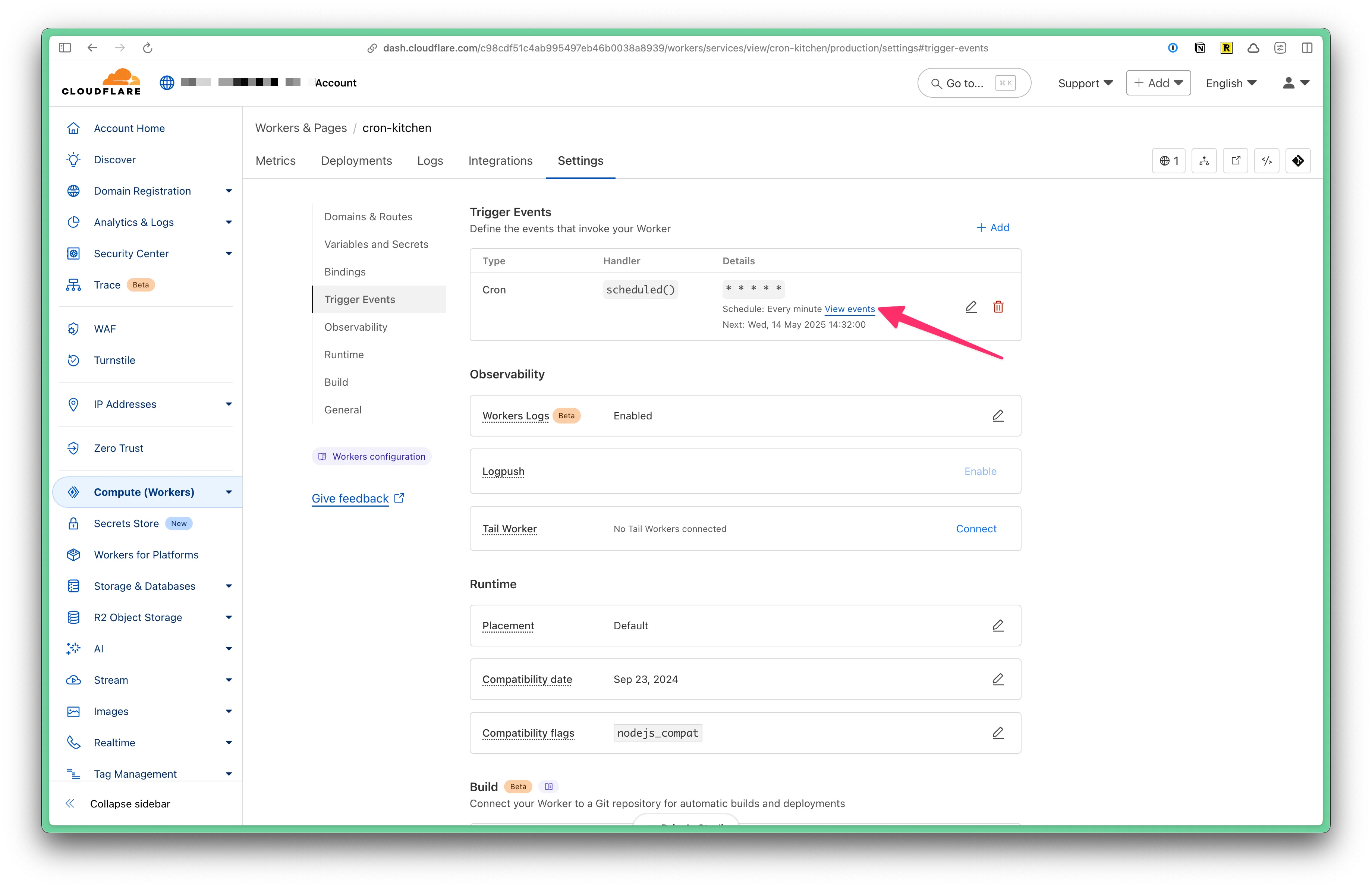 Within the Cloudflare Dashboard UI, you can view all the cron triggers for your worker. Click on the Settings tab, and then click on the Cron Triggers section.