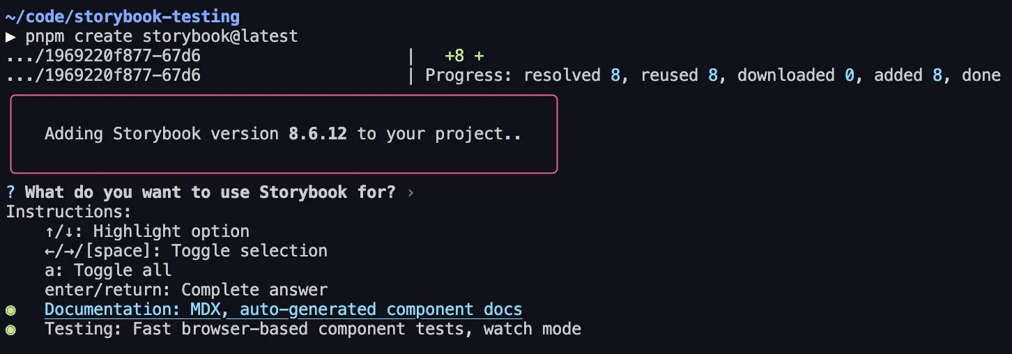 2. Select what we want to use Storybook for — I selected both Documentation and Testing, though this guide will only cover the documentation part: